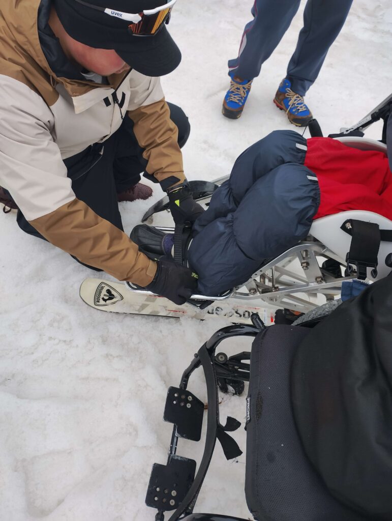 それでもチェアスキーへの移動は大変。指導員や参加者でサポートします。