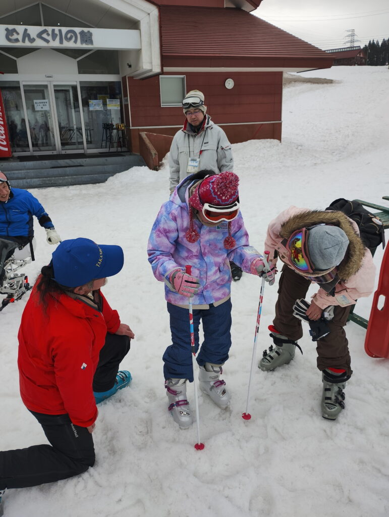 老若男女、さまざまな年代の方々が参加していますよ。可愛らしい参加者もおられます。この写真では中谷指導員がスキーブーツの調整をしてあげています。「痛くないかな?大丈夫?」