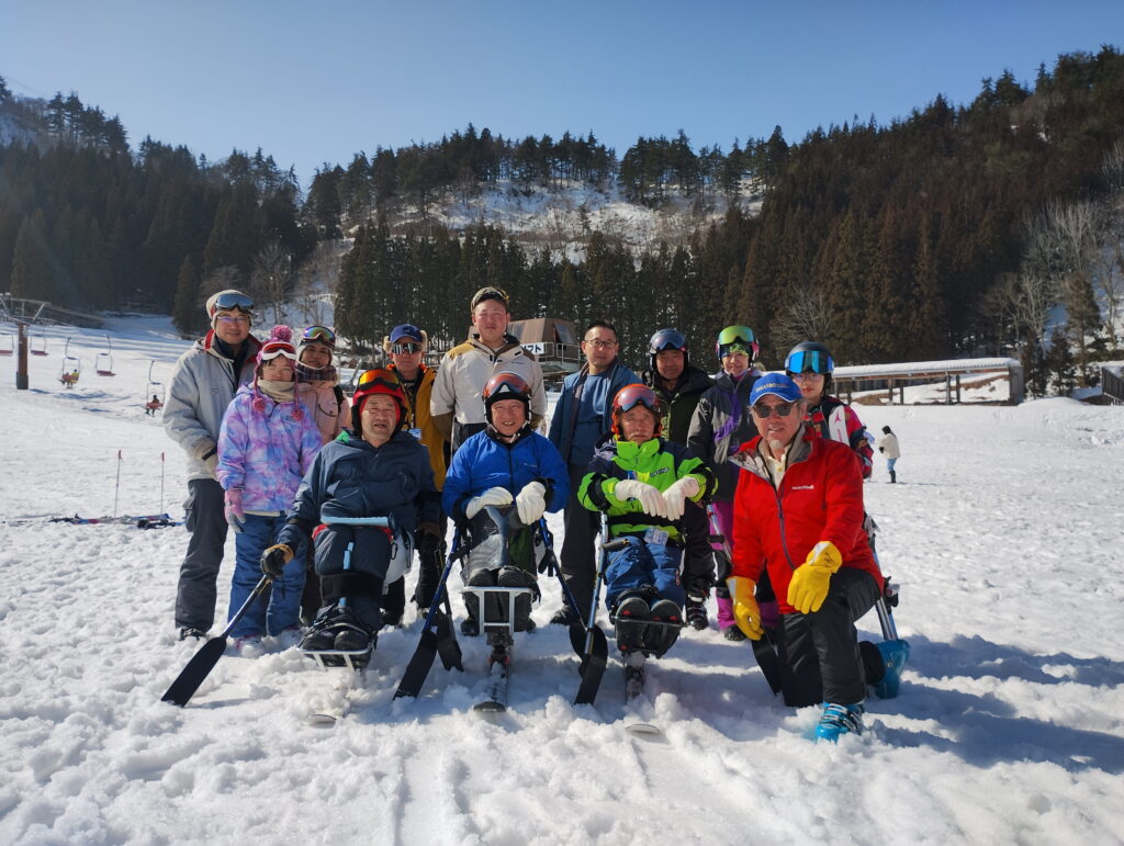 滑り終えて参加者全員の集合写真をパシャリ。みなさんご参加ありがとうございました。スノースポーツ教室ではさまざまな障がい者が参加されております。教室担当の高村さんは車椅子で活動されており、チェアスキーが非常に達者です。また、指導員や慣れた参加者のサポートを受けられますので、ご興味のある方は富山県障害者スポーツ協会に掲載されるスポーツ教室のしおりを御覧ください。